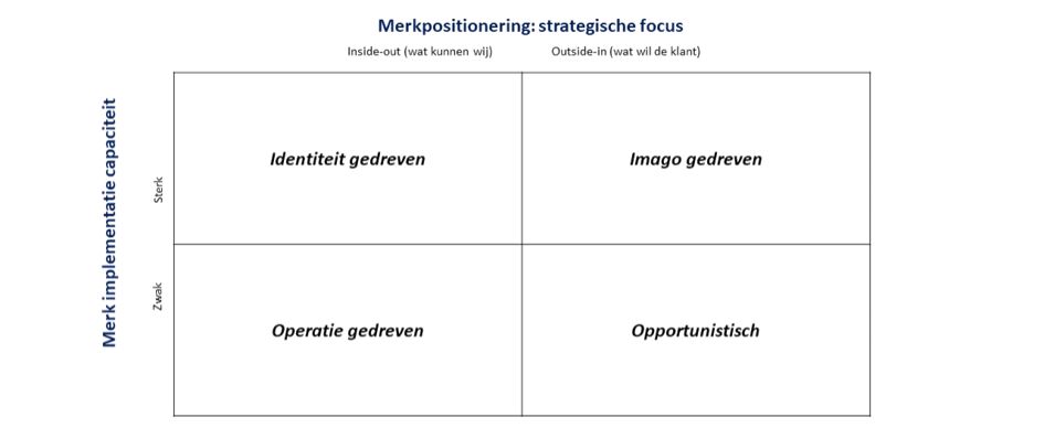 - De strategische dimensie : de positionering gaat uit van wat een bedrijf kán (inside-out) of wat de behoeften van consument en stakeholders zijn (outside-in). Outside-in wordt meestal strategisch beter geacht: een klantgerichte merk-oriëntatie leidt tot een merkbelofte die ‘raakt’. Oftewel: een merkoriëntatie die gericht is op de behoefte van de klant heeft meer effect.
