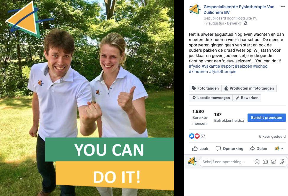 Een groot nadeel is dat de content van je bedrijfspagina steeds minder zichtbaar wordt. Het organische bereik van je berichten was al klein, maar door de focus op groepen zal dit nog kleiner worden. Dus als je met jouw berichten toch de tijdlijn van jouw volgers wilt bereiken dan zal je moeten zorgen voor waardevolle en relevante berichten waar op gereageerd wordt. Mooie voorbeelden hiervan zijn: interviews met klanten/collega therapeuten, vacatures of gebeurtenissen (zwangerschap, diploma, etc.). Een goed voorbeeld van een waardevol en relevant bericht is de bedrijfspagina van Fysiotherapie Van Zuilichem BV: