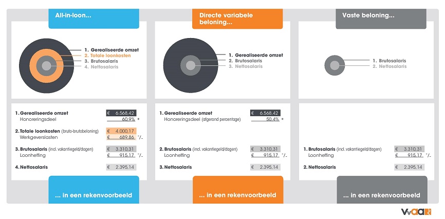 VvAA en andere adviesorganisaties en salarisverwerkers adviseren werkgever en werknemer dan ook om de werkgeverslasten uit de berekening te halen. En dus eenvoudiger te belonen. Een advies dat zij inmiddels breed volgen. Het blijkt goed uit te leggen hoe de berekening zo is aan te passen dat de werknemer op de cent het zelfde salaris ontvangt, zonder dat de werkgeverslasten een rol spelen in die berekening. Het honoreringspercentage wordt daarbij omgerekend. In figuur 1 in de tweede kolom ‘Directe variabele beloning’ ziet u direct hoe dit zich verhoudt met de ‘klassieke’ all-in-loonberekening in de eerste kolom.