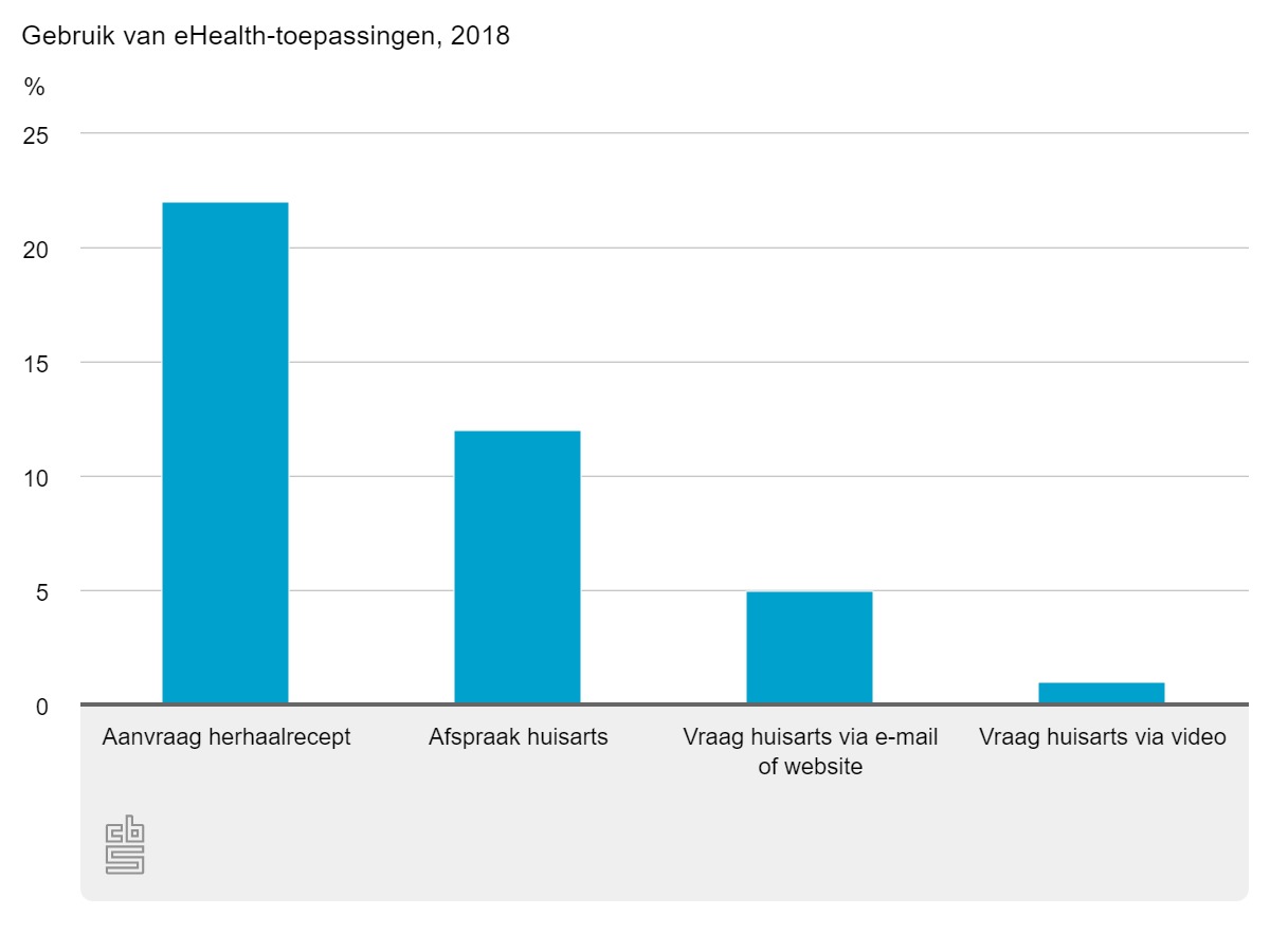 Het CBS keek in het onderzoek Belevingen naar het gebruik van specifieke eHealth-toepassingen in 2018 en de meningen hierover. Hieruit blijkt dat 45 procent van de ondervraagden, die via internet een herhaalrecept bij de huisarts kunnen aanvragen, gebruik maakt van die mogelijkheid. Het gaat hierbij om 22 procent van de volwassen bevolking. Een derde van de ondervraagden wist vorig jaar nog niet of een herhaalrecept via internet mogelijk was bij hun huisarts.