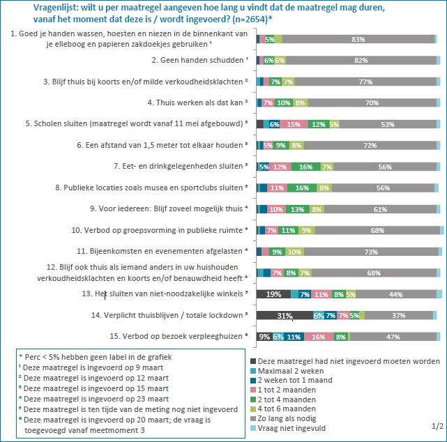 Voor het houden van 1,5 meter afstand en het verbod op groepsvorming in de publieke ruimte laat het onderzoek een lichte daling in acceptatie zien. Voor het thuis blijven en sluiting van scholen, eet- en drinkgelegenheden en publieke locaties is zelfs een significante daling te zien. Voor deze maatregelen geldt dat iets meer dan de meerderheid van de bevolking vindt dat ze zo lang als nodig is van kracht mogen blijven.