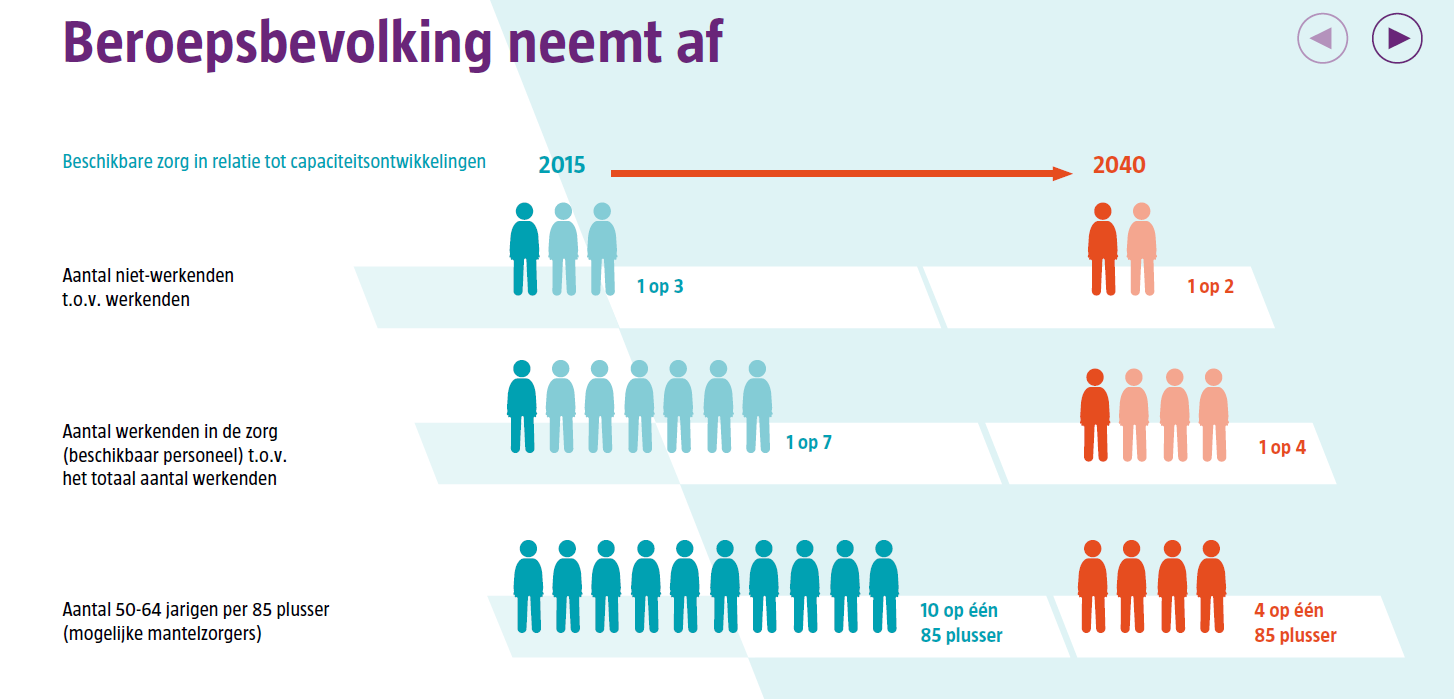 In de komende decennia neemt de vraag naar zorg snel toe. Mensen leven langer en vragen meer zorg. De Sociaal-Economsiche Raad schat dat in 2040 ongeveer twee miljoen zorgmedewerkers nodig zijn, in plaats van de huidige 1,4 miljoen. SER-voorzitter Mariëtte Hamer zegt bij de NOS dat de coronacrisis laat zien dat er een groot tekort aan zorgverleners aankomt (‘ SER slaat alarm: groot personeelstekort in de zorg dreigt ’)