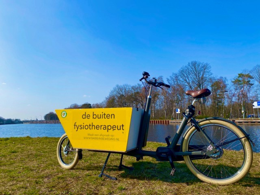 Janneke de Jong-de Vries: ‘Als de buitenfysiotherapeut kom ik met mijn bakfiets bij mensen op locatie. Dit kan thuis, het park om de hoek, op het werk of in een natuurgebied zijn. Het belang van verduurzamen als fysiotherapeut en oefentherapeut is dat omgeving bijdraagt aan gezondheid. Klimaatverandering draagt bij aan het zwakker worden van gezondheid. Een groene en schone omgeving versterkt juist de gezondheid. Dus door te zorgen voor gezonde en duurzame omgeving zorgt de therapeut voor de gezondheid van zijn patiënt. Het betrekken van de gezonde groene leefomgeving versterkt het behandeleffect en verduurzaamt de gedragsverandering.’
