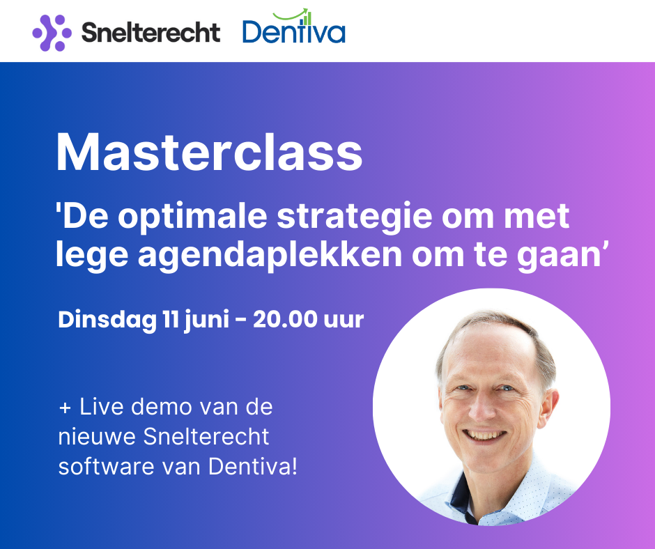 Op dinsdag 11 juni kun je éénmalig deelnemen aan een GRATIS Masterclass van Dentiva waarin je een introductie krijgt van de Snelterecht software. Tijdens de Masterclass ontdek je bovendien nóg 7 strategieën die je helpen om lege agendaplekken terug te dringen. Tot slot, krijg je de mogelijkheid om tijdelijk de eerste maand gratis de Snelterecht software te gebruiken. Kortom, dit wil je niet missen!