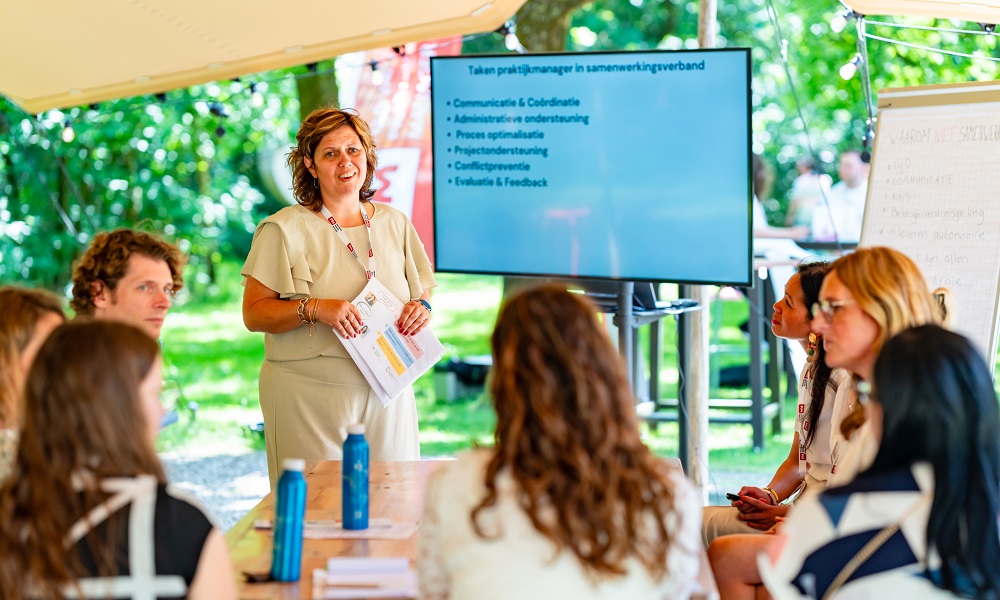 Kim Vermeulen gaf op de Dag van de Praktijkmanager een workshop over interdisciplinaire samenwerking.: ‘Begin met een gedeelde visie. Bouw aan vertrouwen. En realiseer je: samenwerken is geen project, maar een manier van werken.’ (Foto: Jitske Seckel)