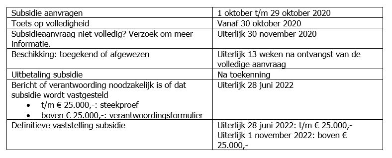 Voor de volledigheid hieronder nog een overzicht van de procedure vanaf aanvraag tot vaststelling van de subsidie.