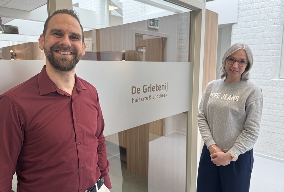 Rayonmanager Jolmer de Boer (Daxtrio) en praktijkmanager Marianne Visser (Dokterszorg Friesland): ‘Bij de nieuwe praktijk bood Jolmer ondersteuning bij de inrichting van het volledig nieuwe pand.’ (Foto: Daxtrio)