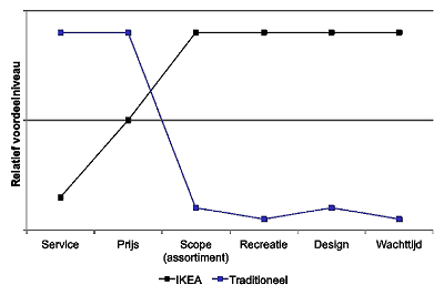 Om dit in uw praktijk te realiseren, moet u als zorgverlener eerst in kaart wat de waardedrijvers zijn van de klantgroep(en) waar u zich op wilt richten. Dit kunnen redenen zijn die belangrijk zijn bij alle dienstverlenende organisaties, zoals vertrouwen of prijs en/of redenen die specifiek belangrijk zijn bij uw organisatie. Bedenk hierbij wat concurrenten (collega’s) op deze waardedrijvers aan deze klantgroep(en) bieden. Maak voor uzelf inzichtelijk waar uw onderscheidend vermogen zit door een waardecurve te maken, zie het voorbeeld van Ikea. Zet op de verticale as het relatieve voordeelniveau (hoog-middel-laag) en op de horizontale as de bepaalde waarde drijvers . Door deze klantgerichte sturing bereikt u niet alleen nieuwe klanten, maar zullen deze klanten ook een hogere klantwaarde ervaren.