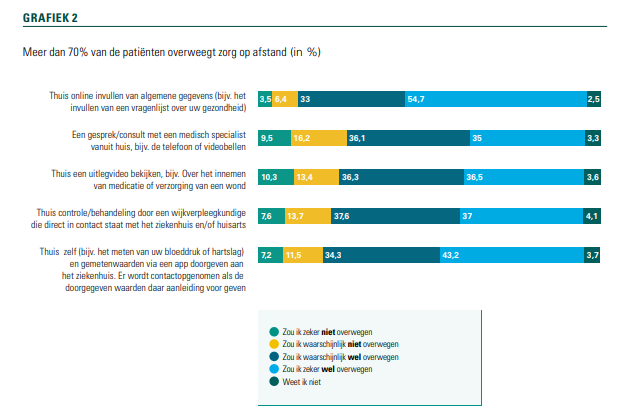 Patiënten met een chronische aandoening ontvangen poliklinische zorg en komen daardoor meerdere keren per jaar op een vast moment in het ziekenhuis. Voor deze groep patiënten kan meer zorg op afstand geleverd worden. ABN AMRO deed hierover onderzoek onder 1228 patiënten, die tussen de één en tien keer per jaar naar het ziekenhuis gaan en waarvan wordt aangenomen dat het gaat om patiënten met een chronische aandoening.