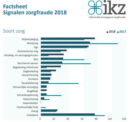 Het aantal fraudesignalen in de mondzorg ligt 17 procent lager dan in 2017 en 25 procent lager ten opzichte van 2016. De meeste signalen kwamen binnen over wijkverpleging. Daarna volgen mondzorg met 69 signalen en de ggz met 67 signalen. Tegenover de 69 fraudesignalen van de mondzorg staan 38 miljoen tandarts-patiëntcontracten, stelt beroepsorganisatie KNMT.