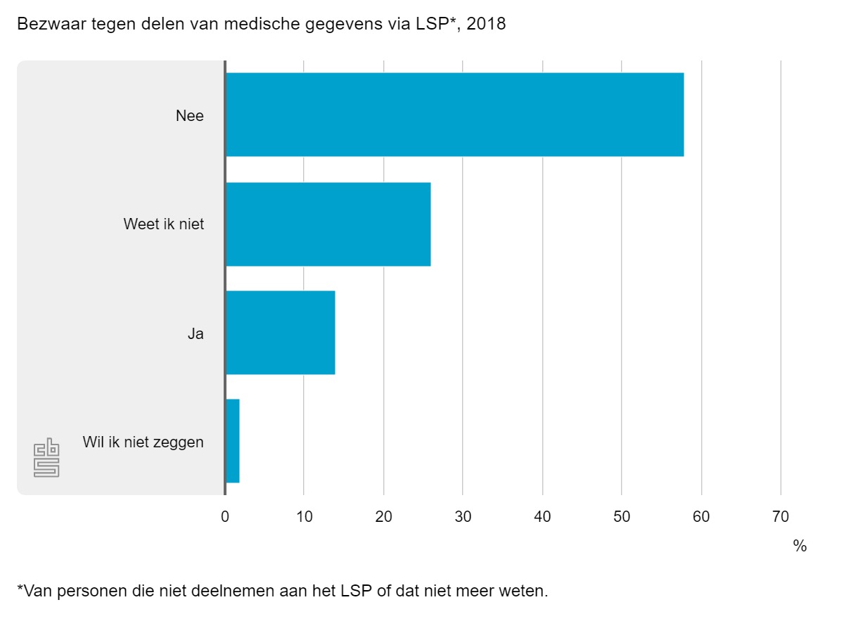 Van de volwassenen die geen toestemming hebben verleend (40 procent), geeft 76 procent aan nooit om toestemming gevraagd te zijn en 24 procent dit te hebben geweigerd. Van de mensen die geen toestemming hebben verleend, geeft 58 procent aan geen bezwaar te hebben tegen het delen van de gegevens. 14 procent heeft wel bezwaren en 28 procent weet het niet of wil dit niet zeggen. Omgerekend weigerde 5 procent van de volwassen bevolking medische gegevens te delen.