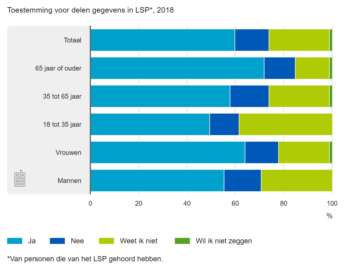 Van de ongeveer 80 procent van de bevolking die bekend is met het LSP, geeft de meerderheid aan toestemming te hebben verleend voor het delen van medische gegevens. 14 procent geeft geen toestemming en een kwart weet het niet of wil het niet zeggen. Vrouwen (64 procent) stemden vaker in met het delen van gegevens dan mannen (55 procent) en ouderen (72 procent) vaker dan jongeren (49 procent). Verder blijkt dat laagopgeleiden (65 procent) vaker toestemming geven dan hoogopgeleiden (54 procent) en volwassenen met een Nederlandse achtergrond (61 procent) vaker dan volwassen met een niet-westerse achtergrond (49 procent). Omgerekend geeft bijna de helft van de volwassen bevolking toestemming voor het delen van medische gegevens via het LSP.