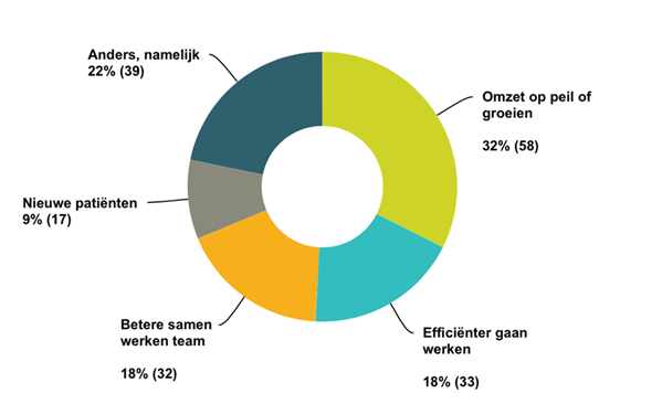 We vroegen respondenten naar drie manieren waarop zij het afgelopen jaar hebben geprobeerd om kostenreductie of omzetverhoging te realiseren. De respondenten bleken iets meer in te zetten op omzetverhoging dan op kostenverlaging. Uitbreiding van het productaanbod wordt genoemd, meer patiënten werven en simpelweg harder werken (meer uren). Bij kostenbesparing wordt vooral kosten besparen door scherper inkopen genoemd, maar ook personeelskosten worden niet ontzien.
