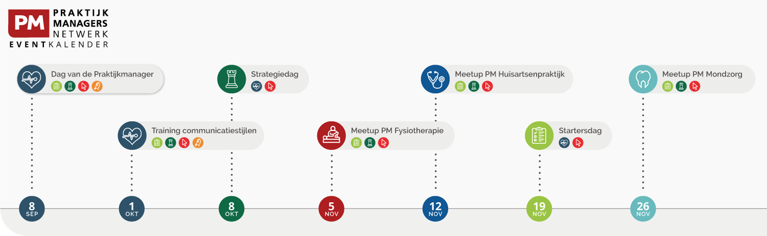 In onderstaande kalender zie je bovenstaande iconen verwerkt. Is het speciaal voor praktijkmanagers van fysiotherapiepraktijken of juist voor alle praktijkmanagers in de eerste lijn? Dat kun je vanaf nu herkennen aan de icoontjes.