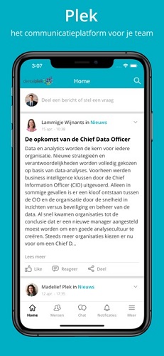 In hoeverre kan Dental Plek worden gebruikt als het centrale communicatiemiddel in de praktijk? ‘Zie het als een intranet waarin alle communicatie loopt, documenten kunnen worden bewaard en alle taken verdeeld’, reageert Vreeswijk. ‘Het is een intranet, maar bij Dental Plek gaat het niet alleen om top-down zenden, maar ook kunnen gebruikers op elkaar reageren en berichten liken, zoals bij sociale media, waardoor je samenhorigheid creëert en ook veel beter weet of berichten gelezen en gewaardeerd worden. We streven er naar dat het platform super gebruiksvriendelijk is: de opzet is heel herkenbaar wat we dagelijks al privé gebruiken, daarvoor is geen training meer nodig.’