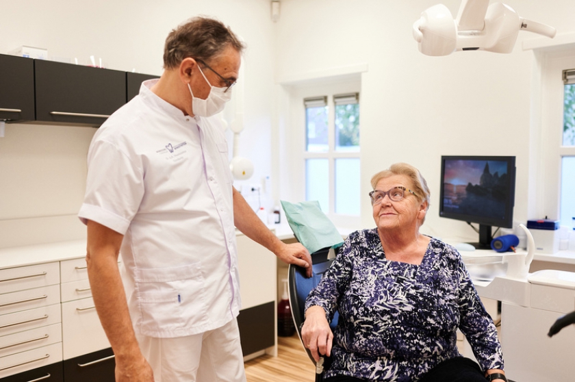 Informatie over de omstandigheden en gezondheid van de oudere zijn eveneens van belang. Gebruikt de oudere een gehoorapparaat, een Canta of een scootmobiel, heeft hij een rollator? Daarvoor is ruimte nodig in de behandelkamer, zegt Bots-Van ’t Spijker. ‘Zorg dat de assistente gericht is op de oudere en weet wat de oudere heeft. Zorg voor een brede toegankelijkheid voor rolstoelen en rollators. De tandarts dient de anamnese telkens goed door te spreken. Leg alle informatie goed vast in het dossier, is een belangrijk punt uit de praktijkwijzer. Niet geschreven is niet gedaan.’