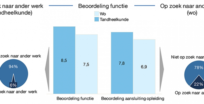 Niet alleen over hun baan zelf, ook over de aansluiting op de arbeidsmarkt zijn de startende tandartsen relatief tevreden. Ze beoordelen deze aansluiting gemiddeld met een 7,8 (tegenover een 6,8 voor de gemiddelde wo-opleiding). Daarnaast zijn tandartsen minder dan gemiddeld op zoek naar ander werk. Slechts 6% geeft anderhalf jaar na afstuderen aan op zoek te zijn naar ander werk, waar dit voor de gemiddelde universitaire studie 22% is.
