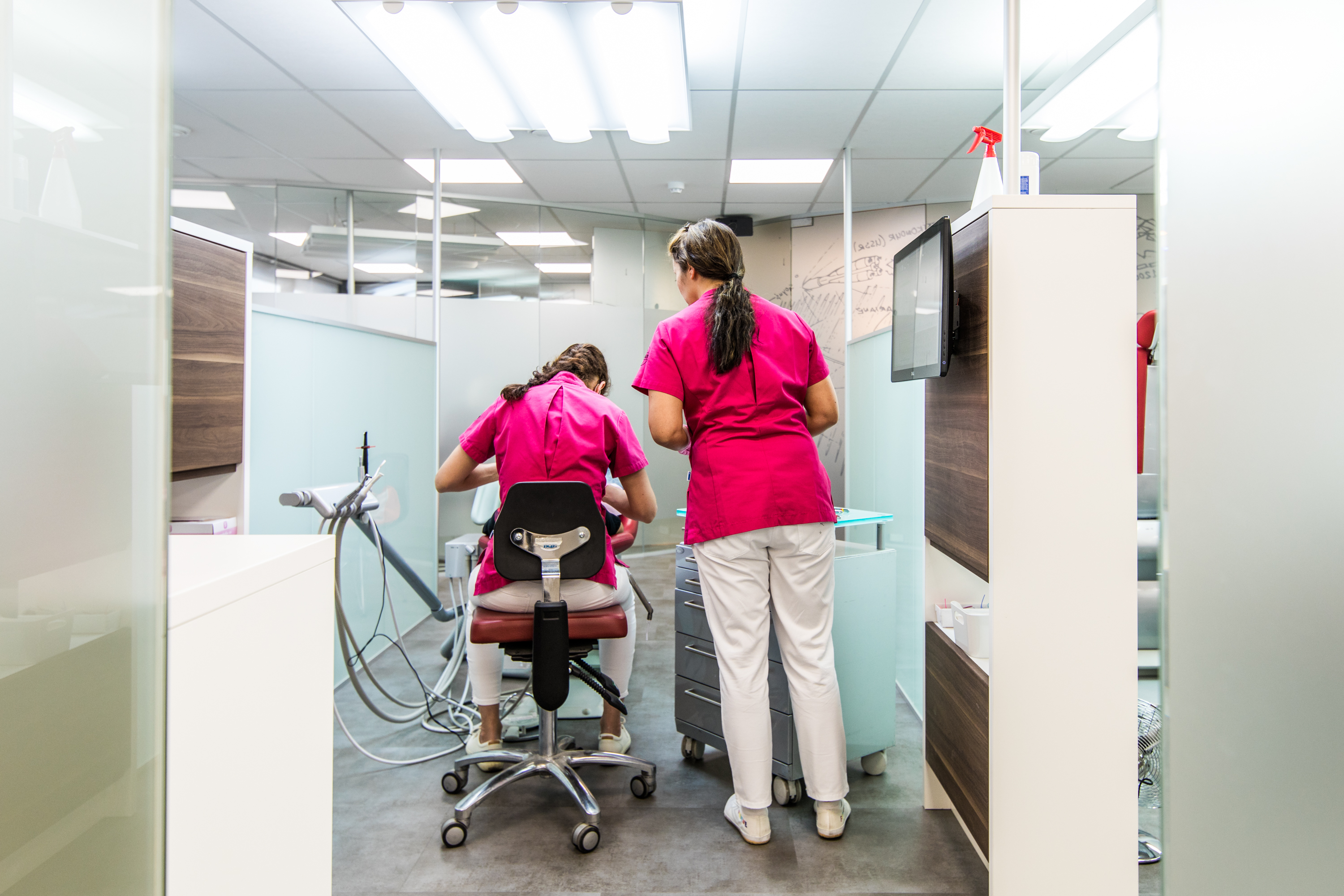In de overlegkamer bespreken Stoker en zijn collega’s met nieuwe patiënten het behandelingstraject en nemen zij een kijkje in de mond. De behandelkamers zijn ondergebracht in één ruimte, met vier behandelstoelen, die door glas van elkaar zijn gescheiden. Hildebrand Stoker: ‘Het glas zorgt voor genoeg privacy, omdat patiënten elkaar niet kunnen zien wanneer zij in de stoel liggen. Deze opstelling zorgt voor een ruime en open sfeer, net als de wachtruimte. Ook dit is een grote ruimte van 10 bij 10, waar patiënten niet allemaal naast elkaar hoeven te zitten.’