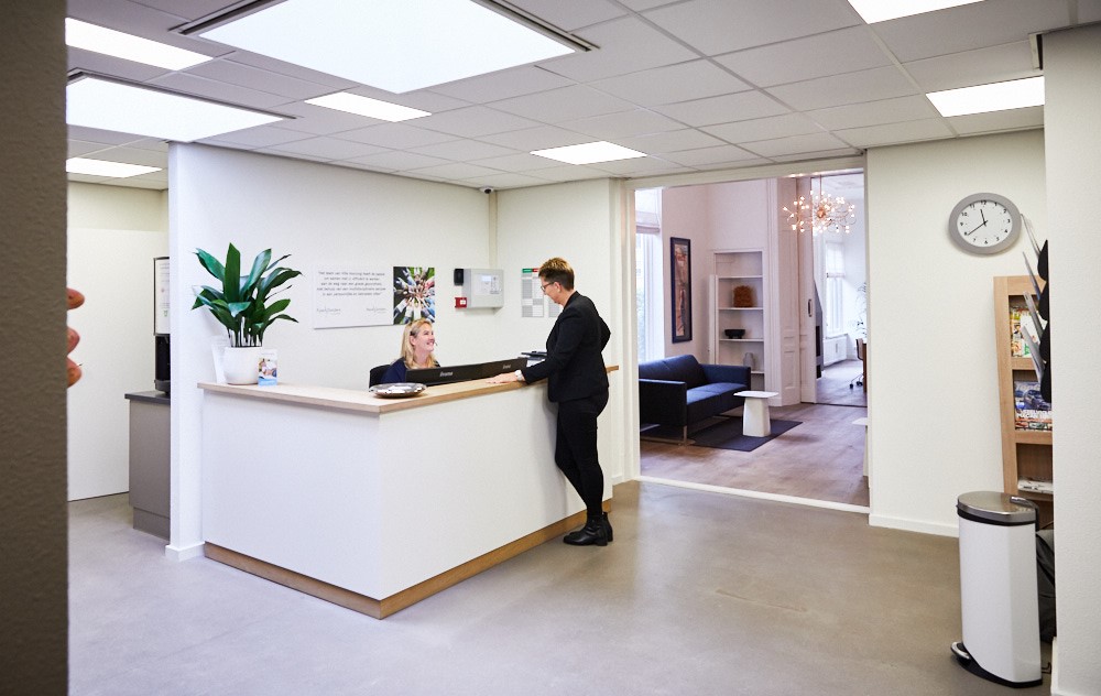 ‘Villa Daalhuizen heeft, net als villa Voorzorg, de sfeer van een huiskamer. De ornamenten van het advocaten- en notarissenkantoor hebben wij behouden en hersteld. De ontvangstruimte heeft eikenhouten tafels, een open haard en veel planten. Iedereen wordt blij van groen, omdat het rust uitstraalt. Zelfs de verlichting is aangepast om in de kamer een rustige sfeer te scheppen. Ook zijn er gordijnen opgehangen om warmte te creëren. De bedoeling is dat je je meteen meteen welkom voelt. Wij noemen het dan ook bewust geen wachtkamer, maar een ontvangstruimte.’