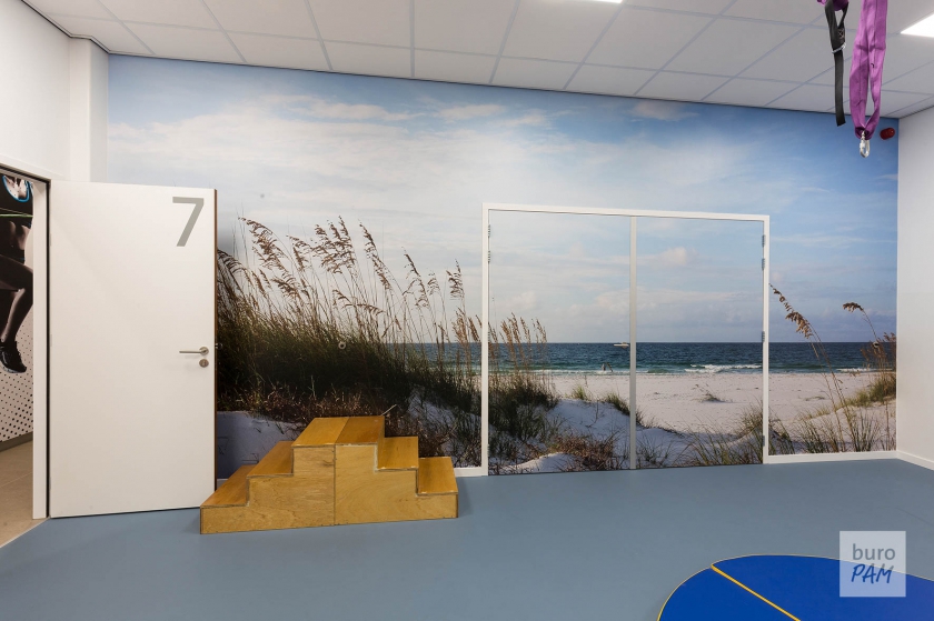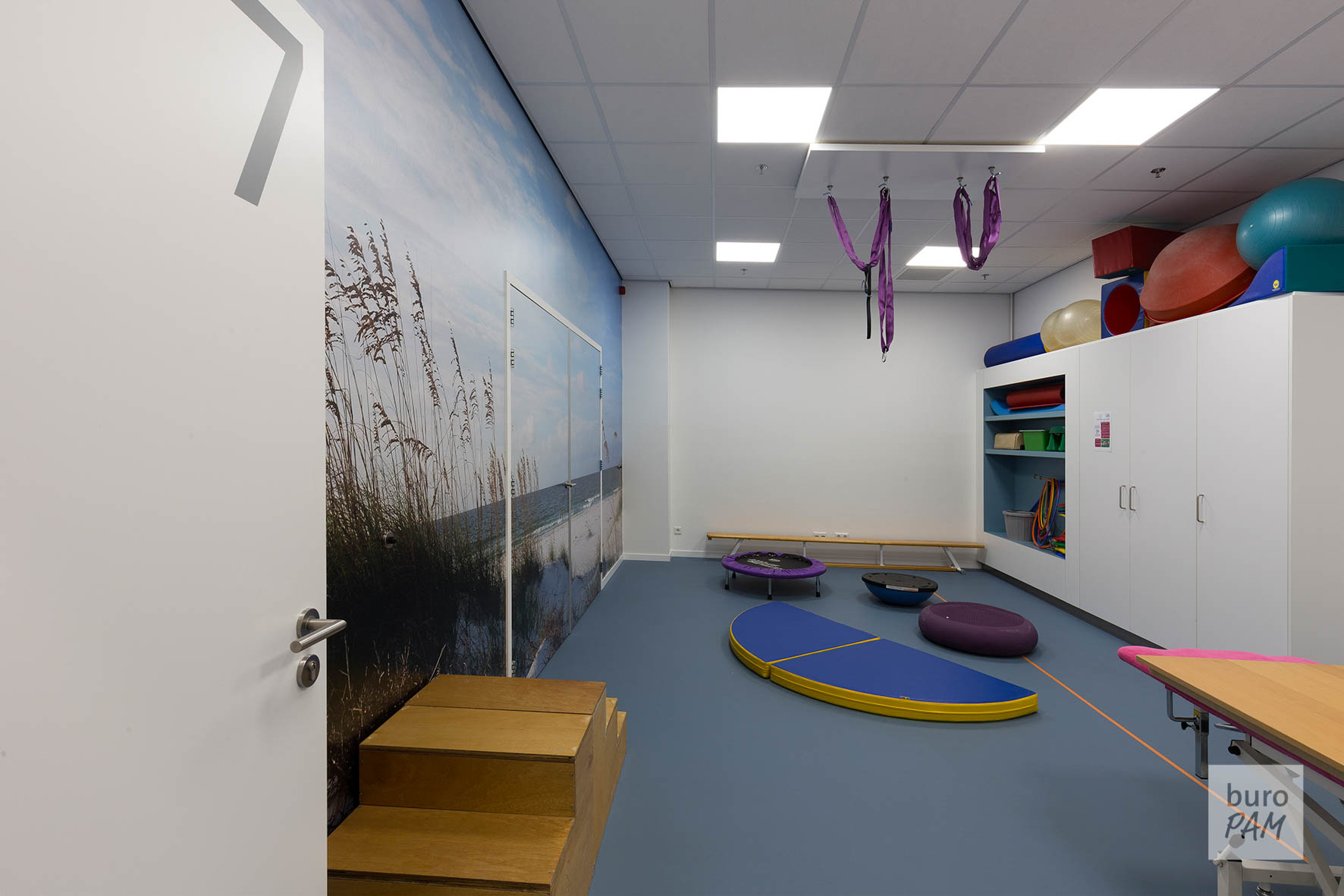De ruimte voor kinderfysiotherapie is groter dan de andere behandelkamers, zodat er motorische testen uitgevoerd kunnen worden en er meer ruimte is voor oefenmateriaal. Ook heeft deze ruimte een sportvloer en een schommel aan het plafond. Vermeulen: ‘De ruimte is afgesloten om te voorkomen dat de kinderen te veel prikkels krijgen. Daarnaast zijn de wanden bestickerd met fotobehang, zodat ze het gevoel krijgen dat ze buiten zijn.’