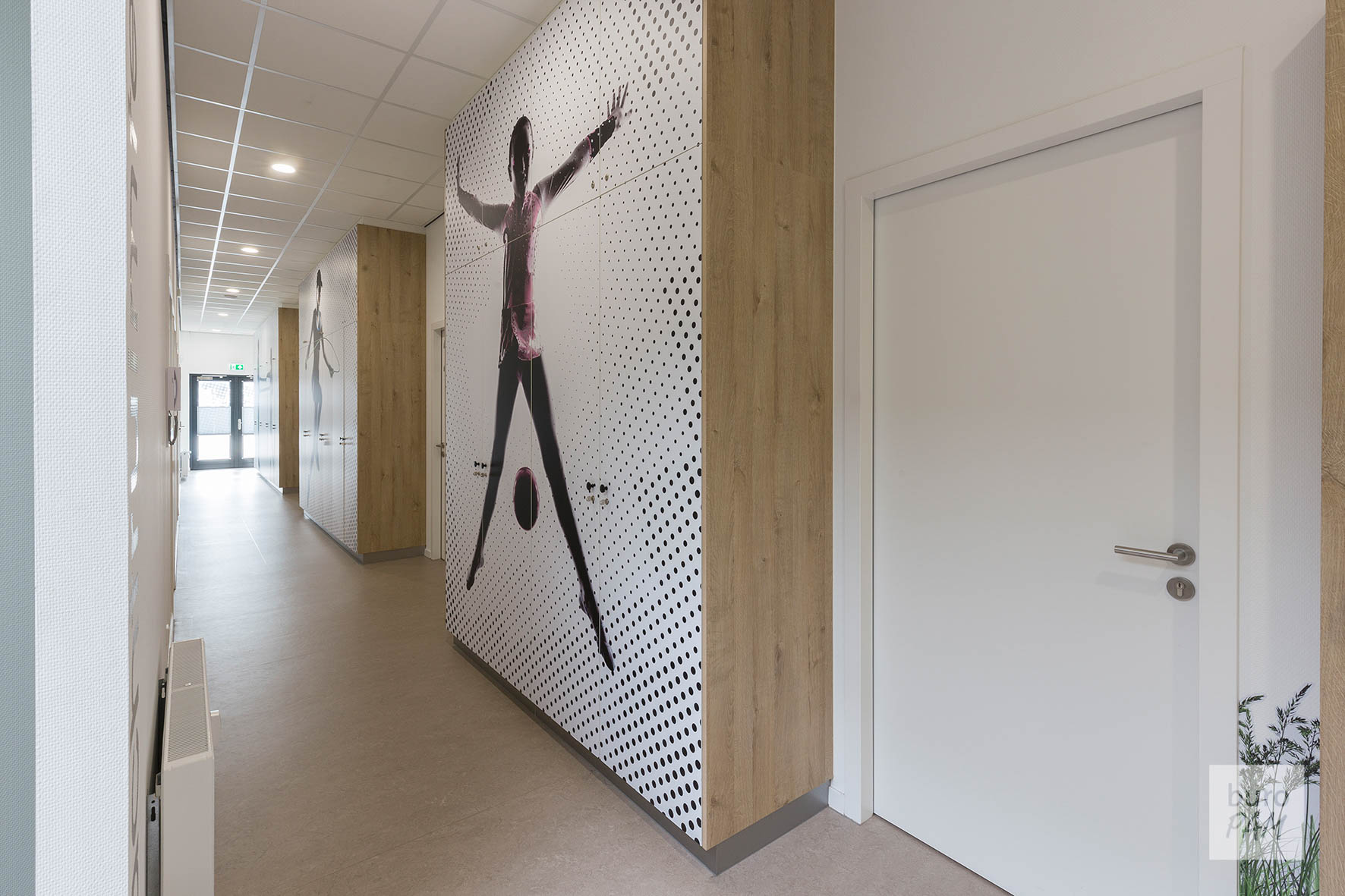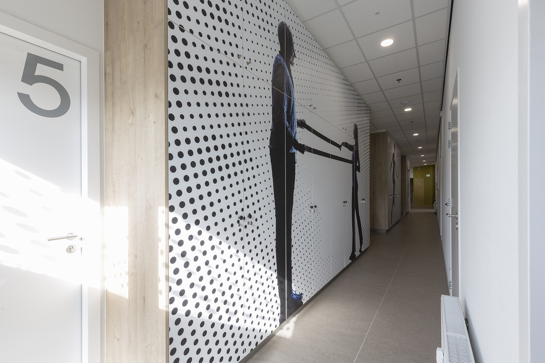Kim Vermeulen vertelt dat de behandelkamers grenzen aan een gang. Daarin staan kasten met oefenmateriaal. 'Deze kasten zijn beplakt met drie grote foto’s van bewegende mensen van al onze doelgroepen. Zo is er een foto met een sportend kind, maar ook een foto met een senior die aan het sporten is. De wandversiering is uitgezocht door een reclamebureau en maakt duidelijk dat bewegen bij ons centraal staat. De mensen zijn allemaal op een andere manier in beweging. De foto’s zijn in de huisstijl van FysioDynamiek gemaakt.’