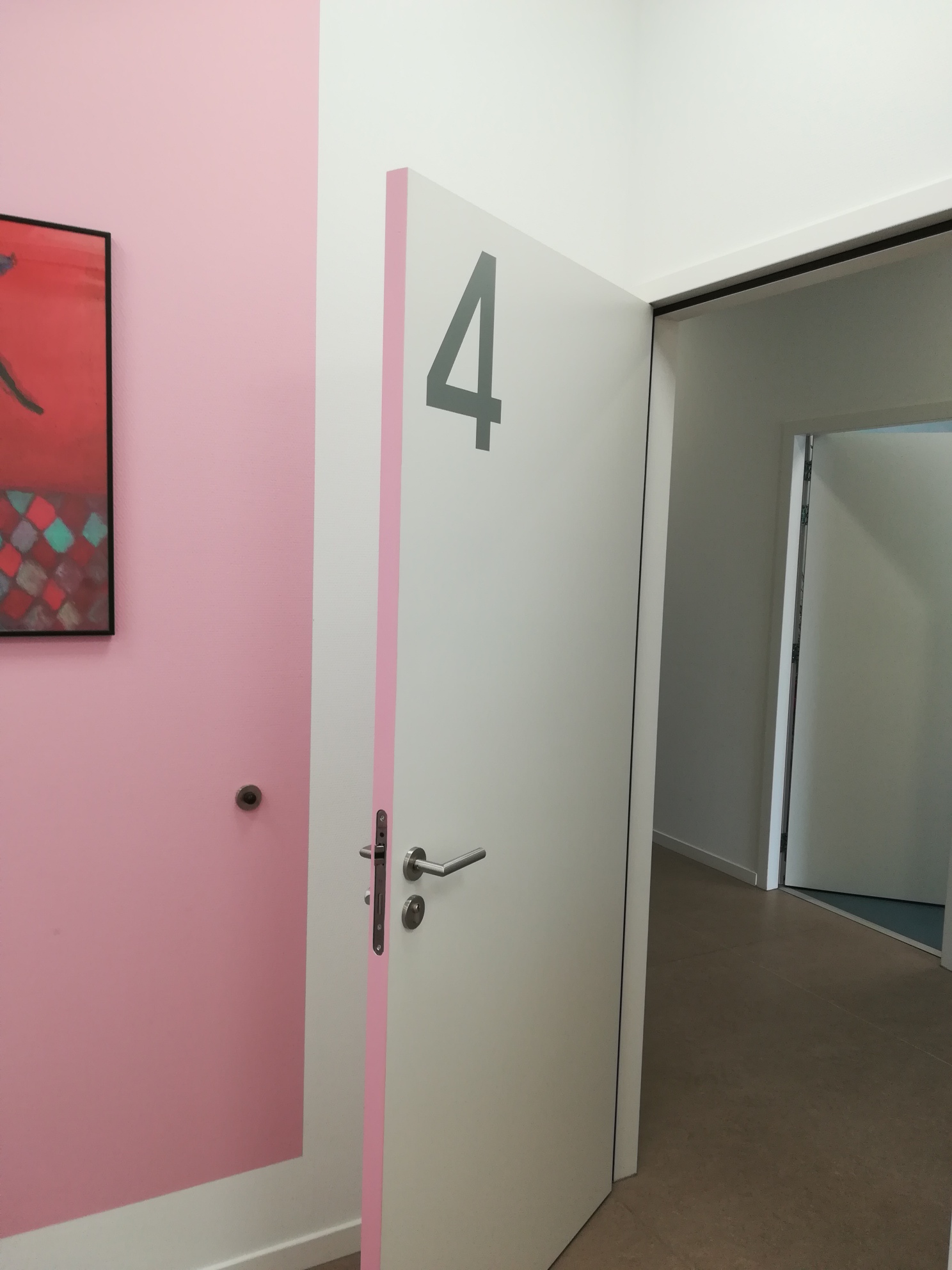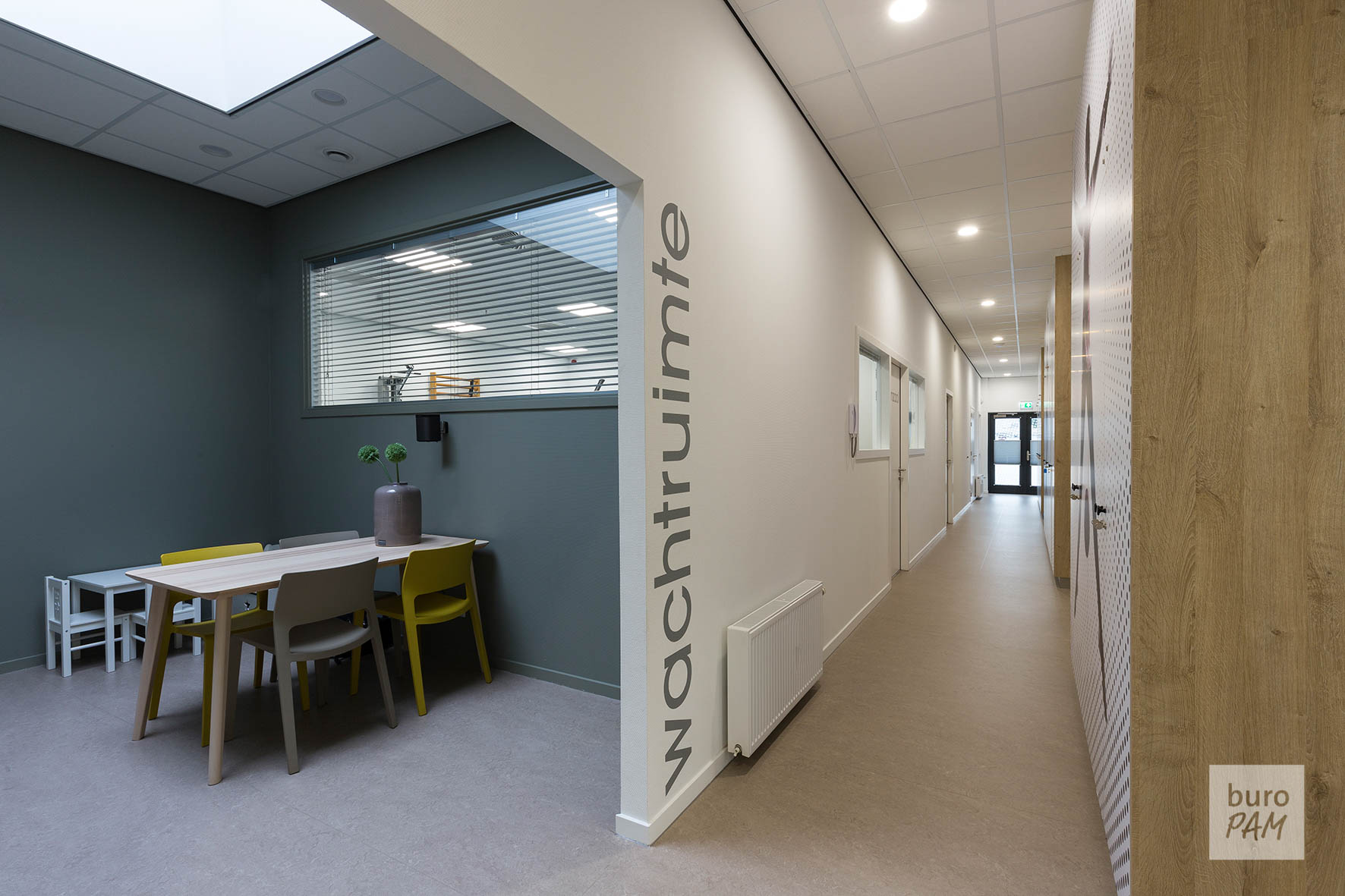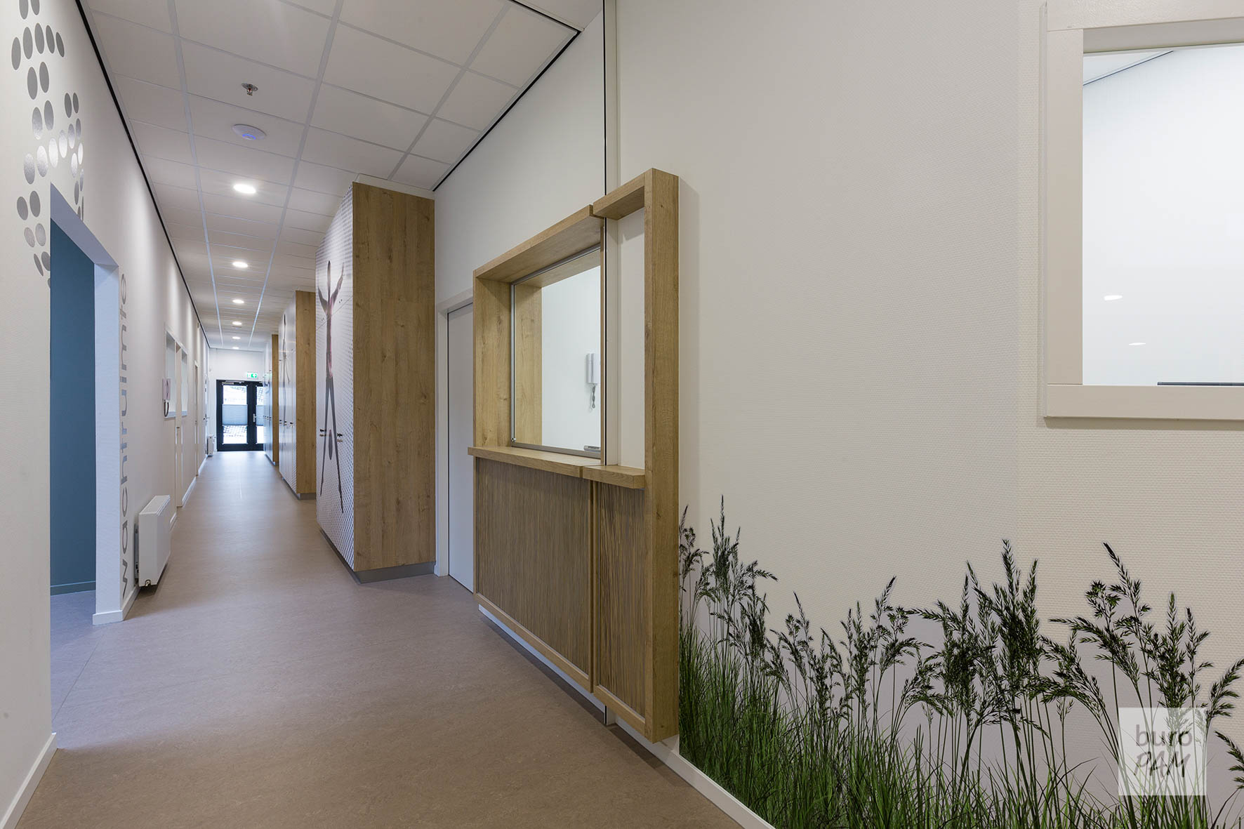 ‘De sfeer van de praktijk is natuurlijk en de kleuren zijn rustig gehouden. Alleen de behandelkamers hebben felle kleuren. Elke behandelkamer heeft een andere kleurenvlak op de muur. Iedereen dacht mee met dit concept. Als grapje is ook de zijkant van de praktijkdeur in dezelfde kleur geverfd. Dit valt je alleen op als je het weet.’