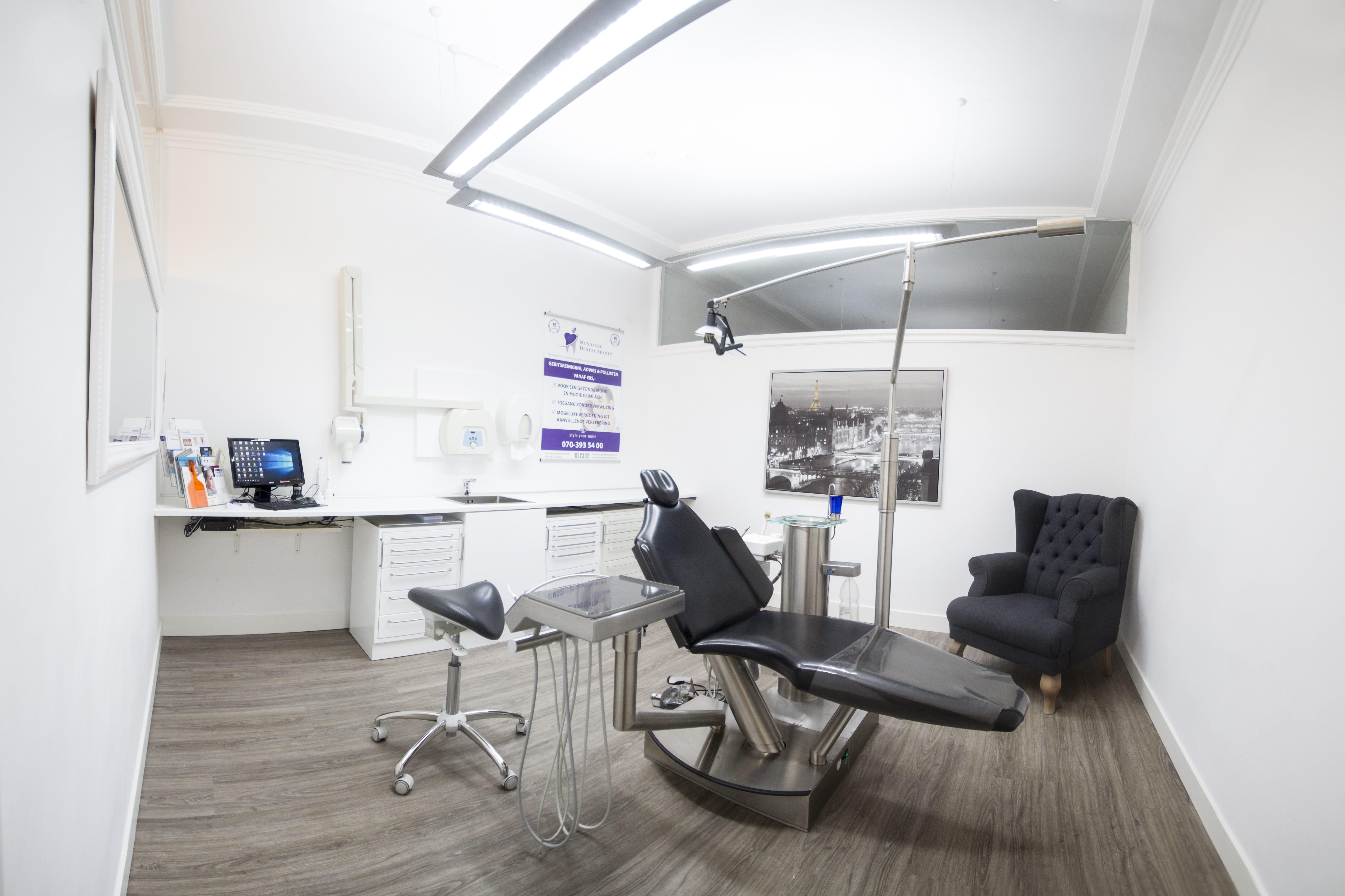 ‘De sfeer van de praktijk is rustig en gemoedelijk. Ik heb vaste medewerkers, die altijd benaderbaar en aanspreekbaar zijn. De rust hoort ook bij de behandelkamer. Zo staat er een grijze RVS-loungestoel naast de behandelstoel. Als patiënten iemand meenemen dan kan die persoon in de behandelruimte wachten. Er komen bijvoorbeeld vaak stelletjes binnen, die graag bij elkaar willen zitten.’