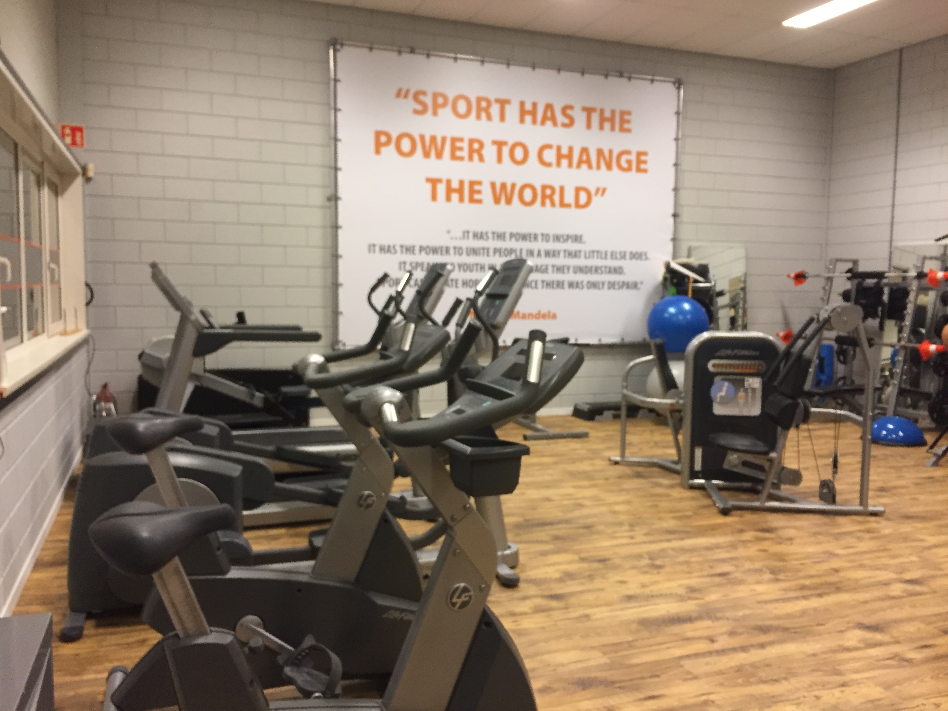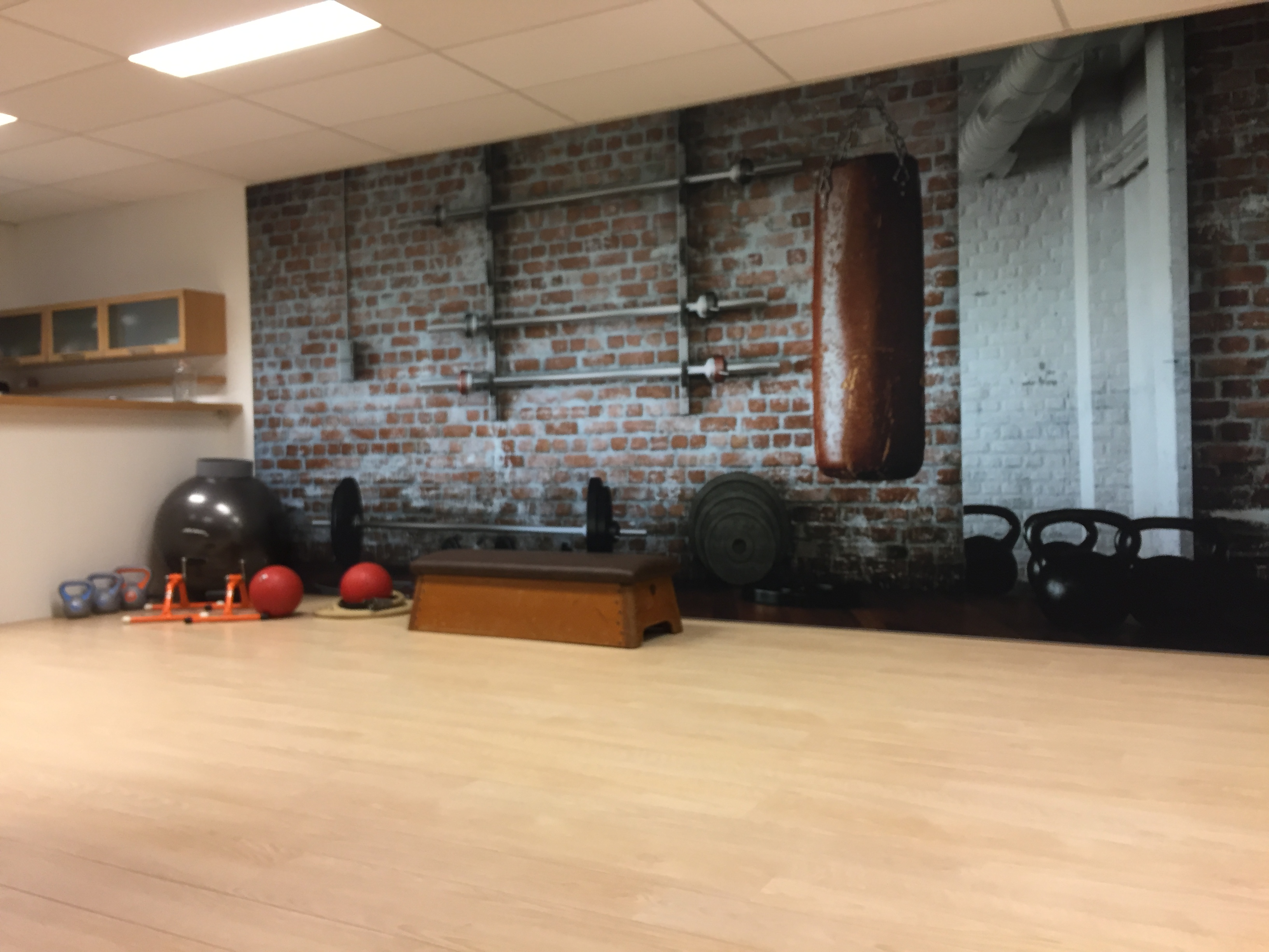 Samen met een reclamebureau heeft Van der Vlist de aankleding van het gebouw ontworpen. Aan de hand van een 3D-computer zijn de ruimtes getekend en is gekeken naar de inrichting. ‘Op deze manier konden wij makkelijk van kleur veranderen en de positie van meubels aanpassen. Dat in de praktijk bewegen centraal staat, maken we duidelijk aan de hand van wandposters en gymaccessoires. In de praktijk maken we een knipoog naar een oude gymzaal door een levensgrote wallprint van een boksbal met halters en dumbells op de eerste verdieping.’ Die sfeer van de oude gymzaal komt ook tot uiting door de plaatsing van een wandrek, die de kleine wachtkamer afscheidt van de trainingszaal. Verder heeft de oefenruimte typische gymaccessoires als hoepels en een bok. Bovendien doet een oude turnkast dienst als wachtbank. Van der Vlist: ‘Nieuw en oud worden samengebracht in onze praktijk. Het is een echte fysiopraktijk, maar met een knipoog naar een oude gymzaal.’