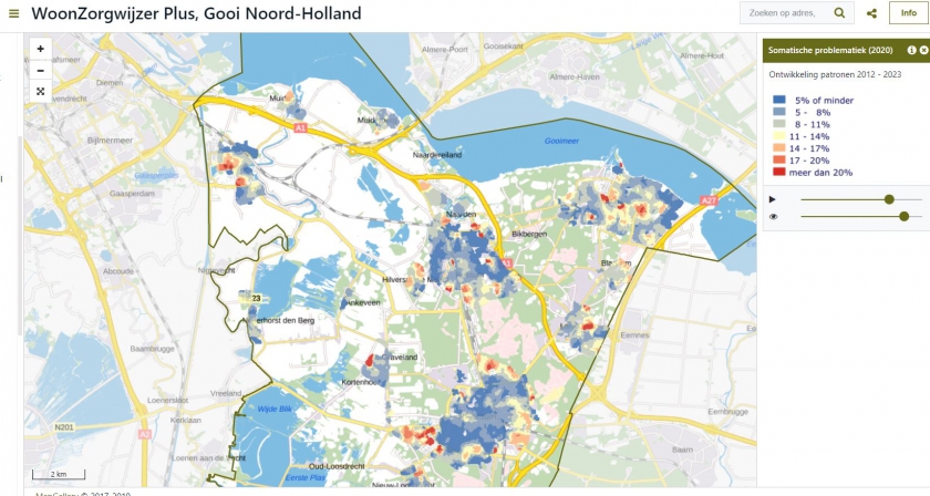 De gegevens uit de WoonZorgWijzer kunnen zorgverleners goed gebruiken. Die toepassing is gebouwd voor heel Nederland, waarin je de verwachte zorg per buurt kunt weergeven op gedetailleerd niveau. Je kunt trends signaleren per deelgebied. De WoonZorgwijzer geeft een voorspelling op basis van populatiekenmerken over de verwachte zorg in een bepaald gebied. ‘Het gaat niet over procesdata of over hoe je als praktijk presteert. De gegevens helpen je om breder te kijken dan je eigen praktijk’, benadrukt Scholten.