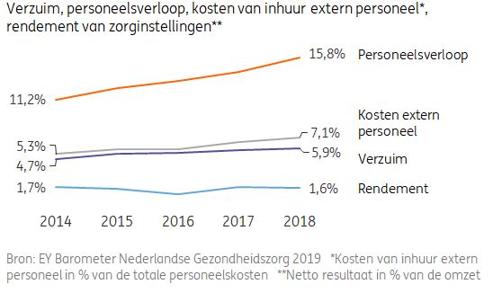 Het personeelstekort in de zorg drukt op de groei van het zorgvolume en zorgt voor oplopende wachttijden. De norm voor wachttijden voor diagnostiek in het ziekenhuis werd in 2018 al met 21 procent overschreden. De wachttijd voor behandeling in het ziekenhuis werd zelfs overschreden met 24 procent. Dit komt vooral vanwege de stijging van ziekteverzuim en het verloop van personeel. Daardoor lopen de kosten op en worden zorginstellingen onder druk gezet.